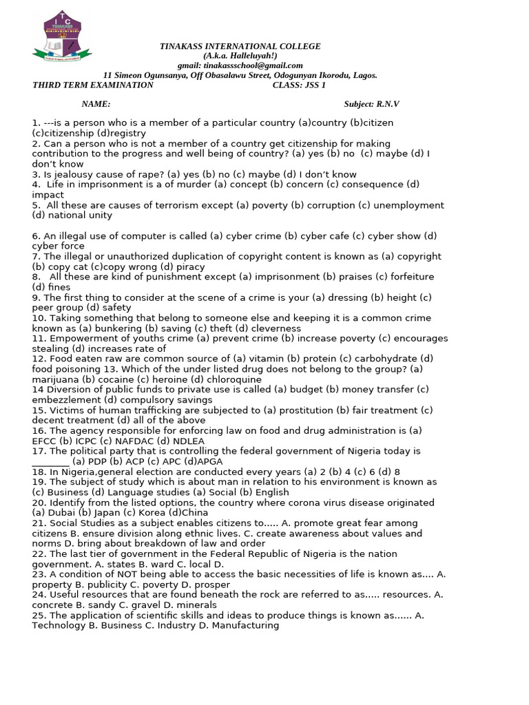 THIRD TERM EXAMINATION CLASS: JSS 1