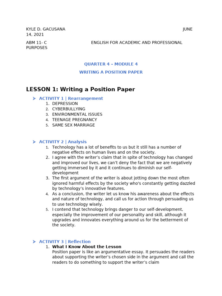 Choosing an argument/issue and position/claim to defend takes a lot of