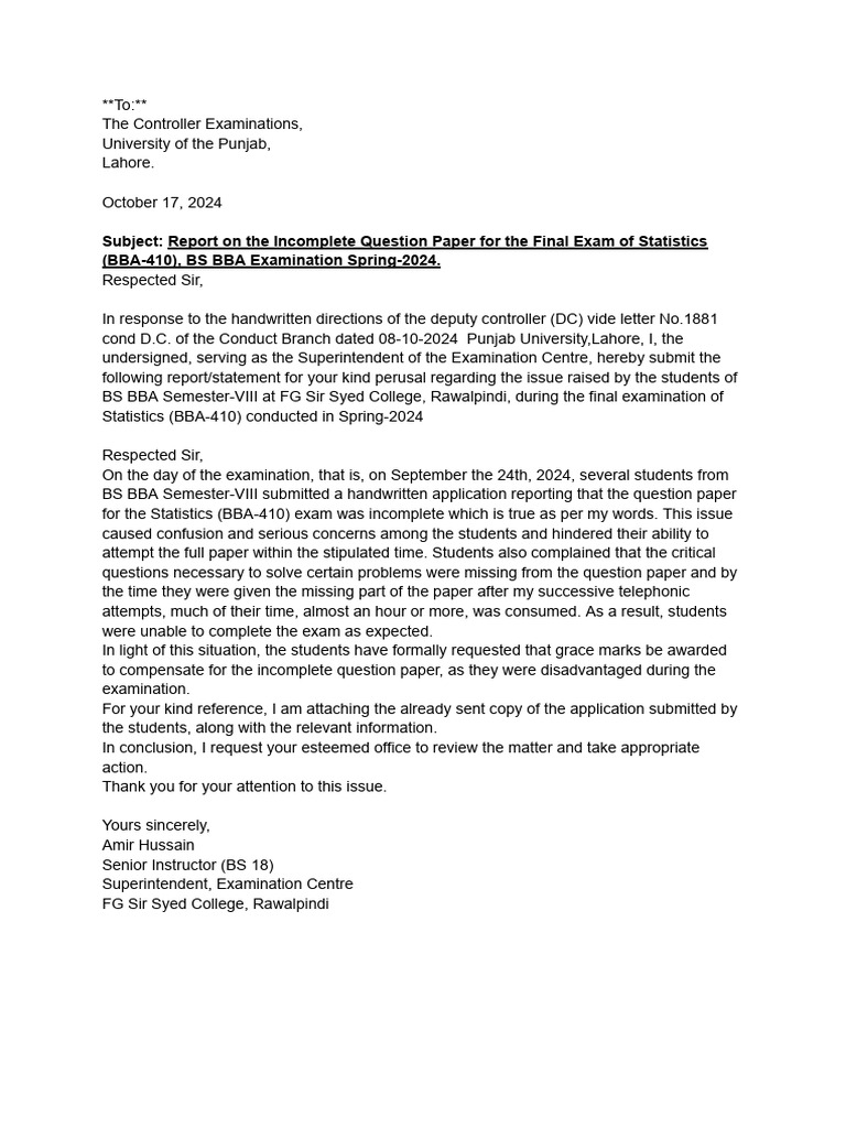 for the Statistics (BBA-410) exam was incomplete which is true as per my words. This issue