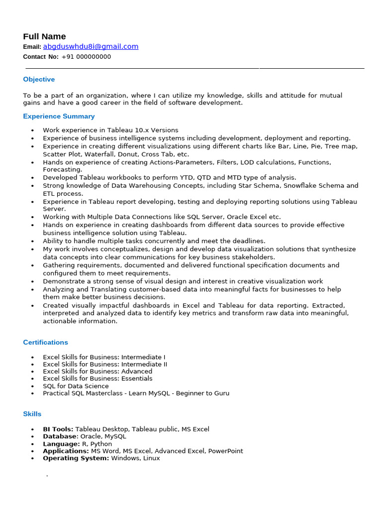 BI Tools: Tableau Desktop, Tableau public, MS Excel