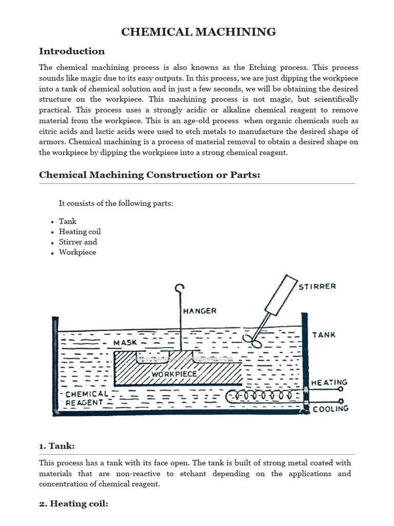 The working principle of chemical machining is based on chemical etchant. An etchant is