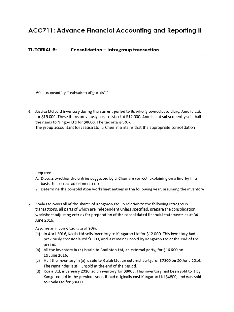 6. Jessica Ltd sold inventory during the current period to its wholly owned subsidiary, Amelie Ltd,