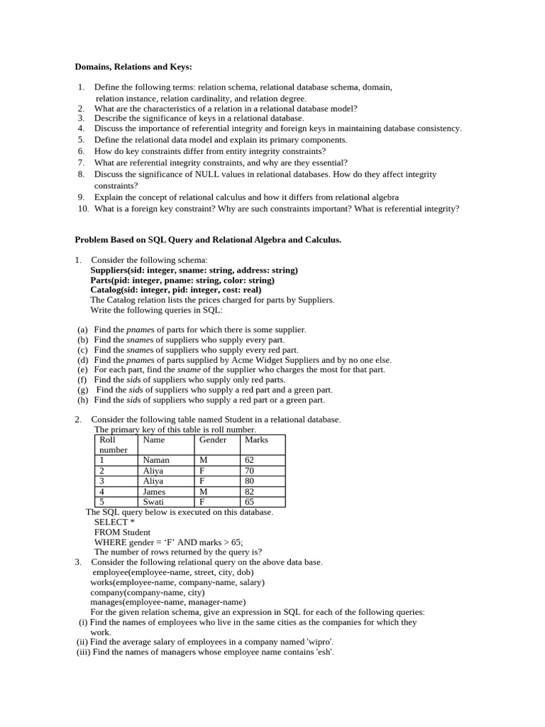 Problem Based on SQL Query and Relational Algebra and Calculus.