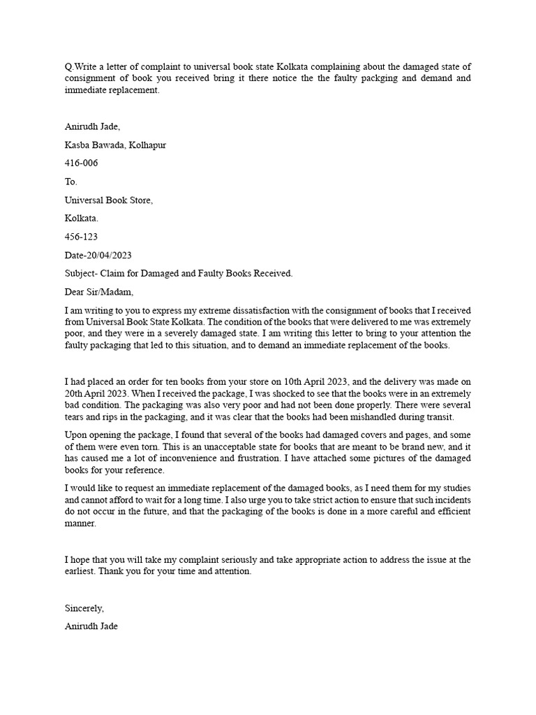 Write a letter of complaint to universal book state Kolkata complaining about the damaged state of