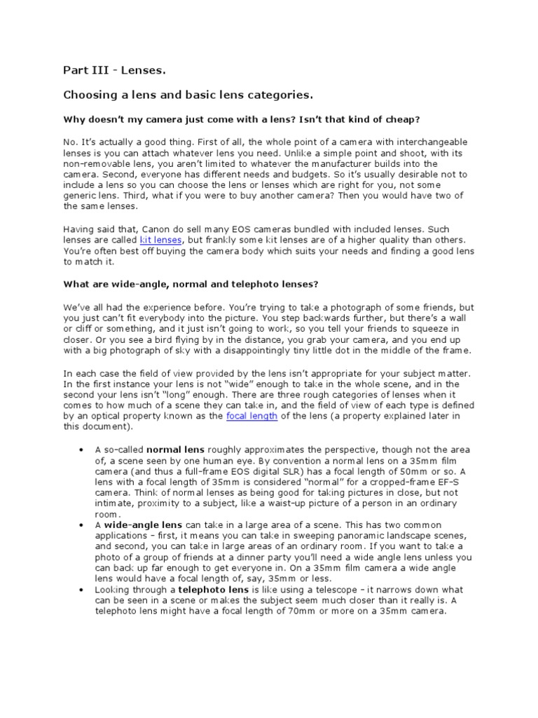 Why doesnt my camera just come with a lens? Isnt that kind of cheap? No. Its actually a good thing. First of all, the whole point of a camera with interchangeable lenses is you can attach whatever lens you need. Unlike a simple point and shoot, with its non-removable lens, you arent limited to whatever the manufacturer builds into the camera. Second, everyone has different needs and budgets. So its usually desirable not to include a lens so you can choose the lens or lenses which are right for you, not some generic lens. Third, what if you were to buy another camera? Then you would have two of the same lenses. Having said that, Canon do sell many EOS cameras bundled with included lenses. Such lenses are called kit lenses, but frankly some kit lenses are of a higher quality than others. Youre often best off buying the camera body which suits your needs and finding a good lens to match it. What are wide-angle, normal and telephoto lenses? Weve all had the experience before. Youre trying to take a photograph of some friends, but you just cant fit everybody into the picture. You step backwards further, but theres a wall or cliff or something, and it just isnt going to work, so you tell your friends to squeeze in closer. Or you see a bird flying by in the distance, you grab your camera, and you end up with a big photograph of sky with a disappointingly tiny little dot in the middle of the frame. In each case the field of view provided by the lens isnt appropriate for your subject matter. In the first instance your lens is not wide enough to take in the whole scene, and in the second your lens isnt long enough. There are three rough categories of lenses when it comes to how much of a scene they can take in, and the field of view of each type is defined by an optical property known as the focal length of the lens (a property explained later in this document). A so-called normal lens roughly approximates the perspective, though not the area of, a scene seen by one human eye. By convention a normal lens on a 35mm film camera (and thus a full-frame EOS digital SLR) has a focal length of 50mm or so. A lens with a focal length of 35mm is considered normal for a cropped-frame EF-S camera. Think of normal lenses as being good for taking pictures in close, but not intimate, proximity to a subject, like a waist-up picture of a person in an ordinary room. A wide-angle lens can take in a large area of a scene. This has two common applications - first, it means you can take in sweeping panoramic landscape scenes, and second, you can take in large areas of an ordinary room. If you want to take a photo of a group of friends at a dinner party youll need a wide angle lens unless you can back up far enough to get everyone in. On a 35mm film camera a wide angle lens would have a focal length of, say, 35mm or less. Looking through a telephoto lens is like using a telescope - it narrows down what can be seen in a scene or makes the subject seem much closer than it really is. A telephoto lens might have a focal length of 70mm or more on a 35mm camera.