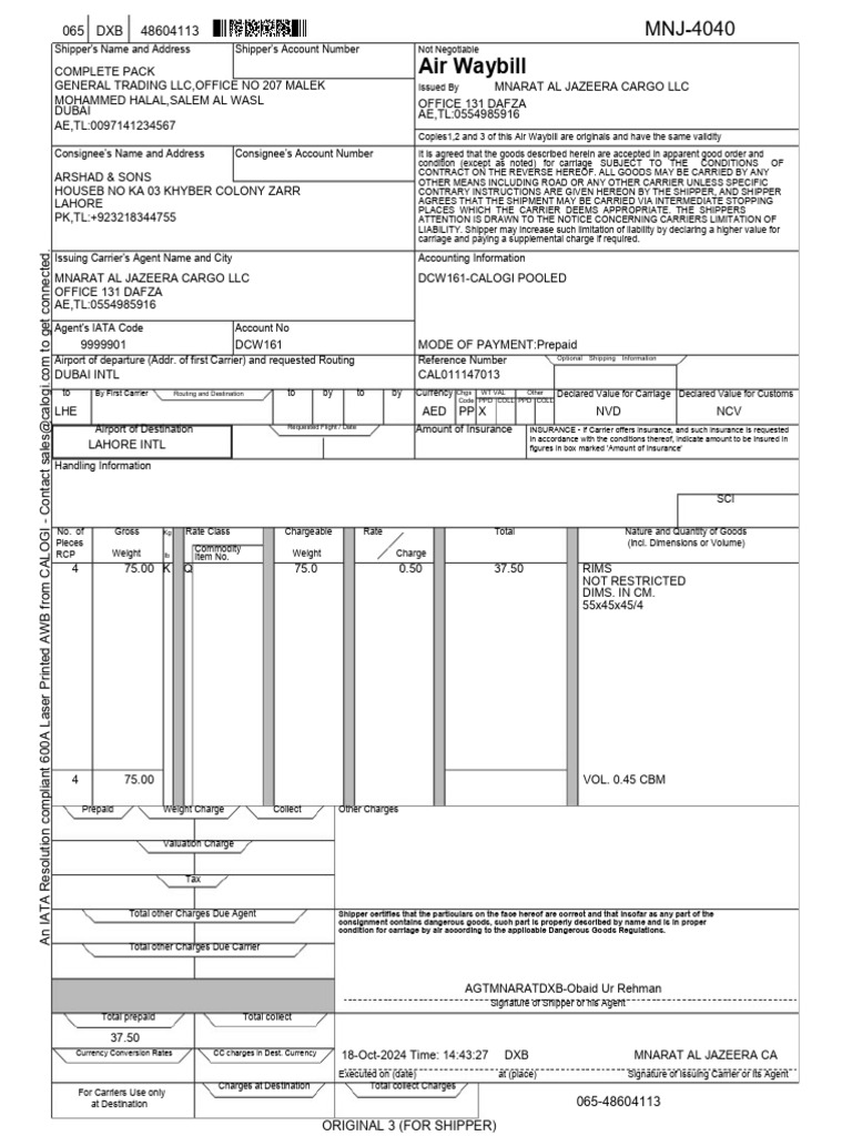 GENERAL TRADING LLC,OFFICE NO 207 MALEK Issued By MNARAT AL JAZEERA CARGO LLC