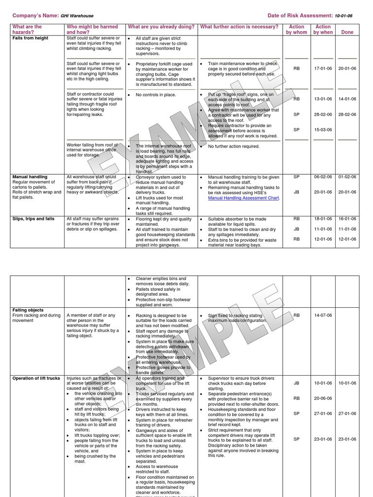 Manual handling training to be given to all warehouse staff. Remaining manual handling tasks to be risk assessed using HSEs Manual Handling Assessment Chart.