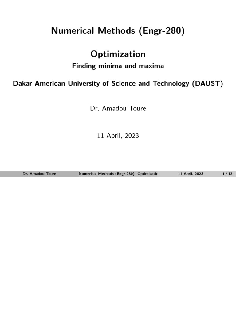 Dr. Amadou Toure Numerical Methods (Engr-280) Optimization 11 April, 2023 12 / 12