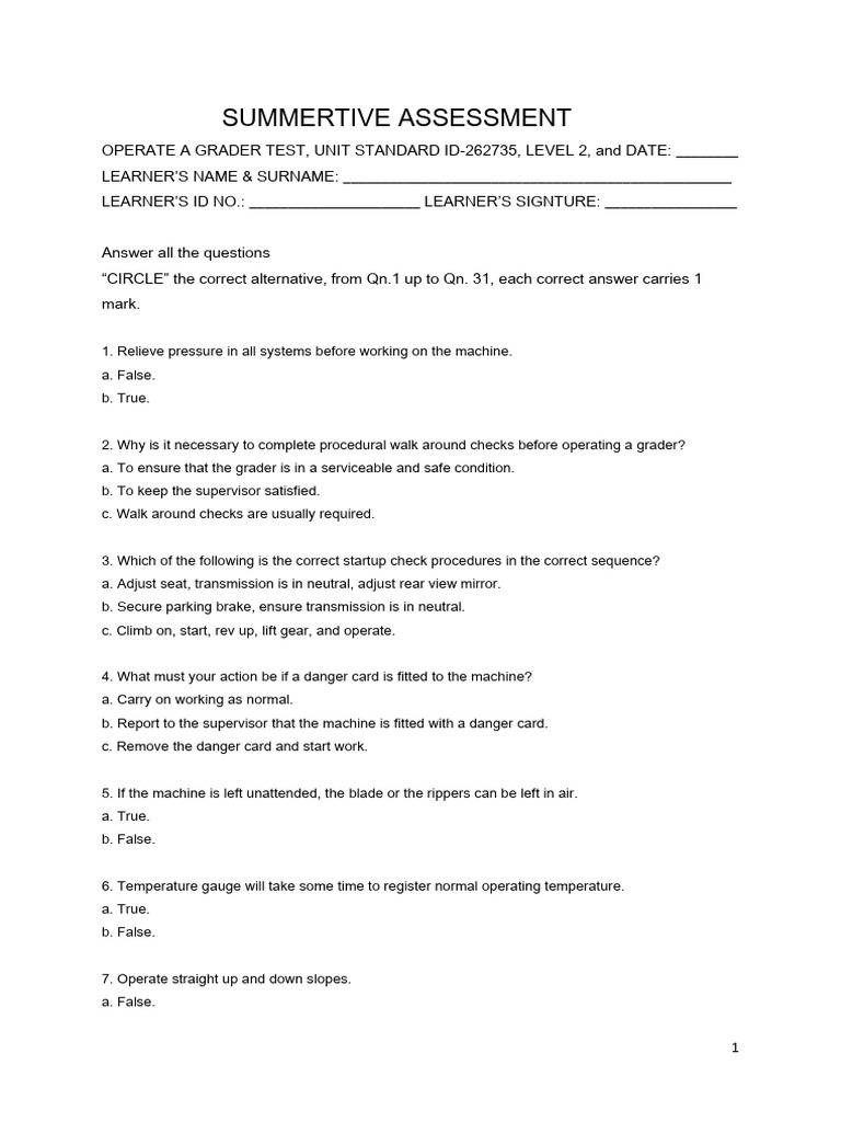OPERATE A GRADER TEST, UNIT STANDARD ID-262735, LEVEL 2, and DATE: ________
