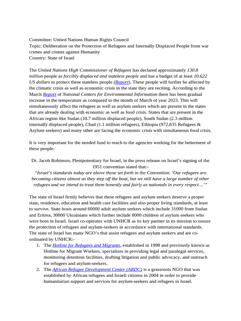 Topic: Deliberation on the Protection of Refugees and Internally Displaced People from war