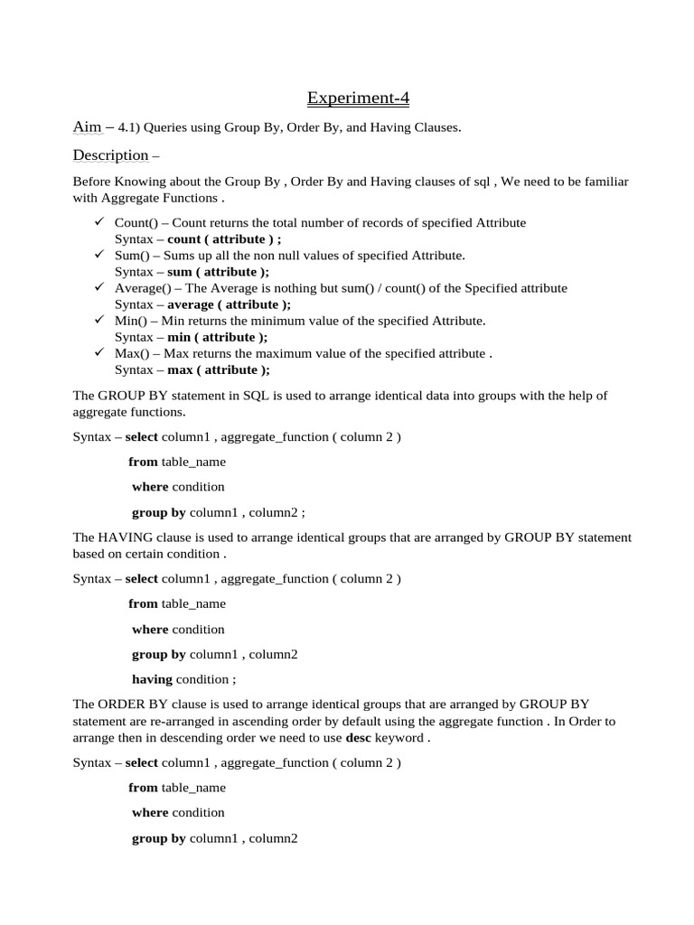 Aim – 4.1) Queries using Group By, Order By, and Having Clauses.