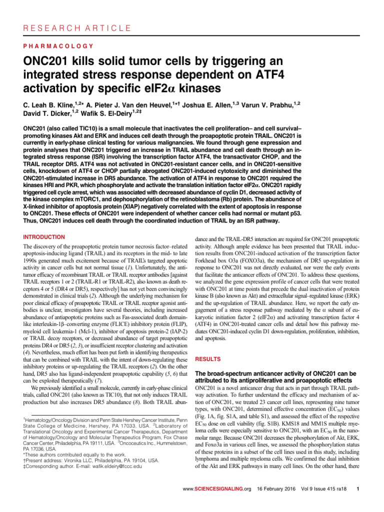 Biochem. J. 412, 579–588 (2008). 45. V. V. Prabhu, J. E. Allen, D. T. Dicker, W. S. El-Deiry, Small-molecule ONC201/TIC10