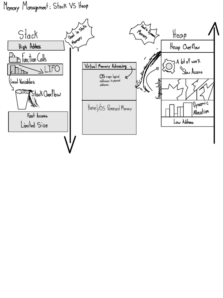 efficiently. It involves managing two primary types of memory: stack and heap, as illustrated in your diagram. Here’s a breakdown of how memory