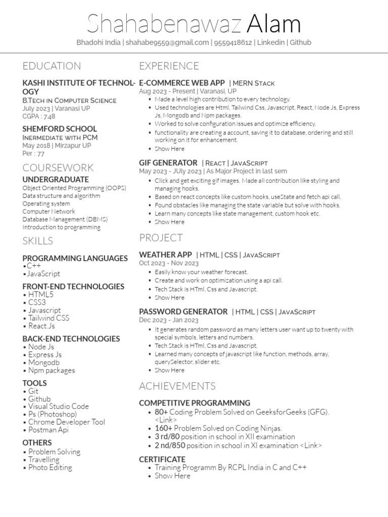 Bhadohi India | shahabe9559@[Link] | 9559418612 | Linkedin | Github