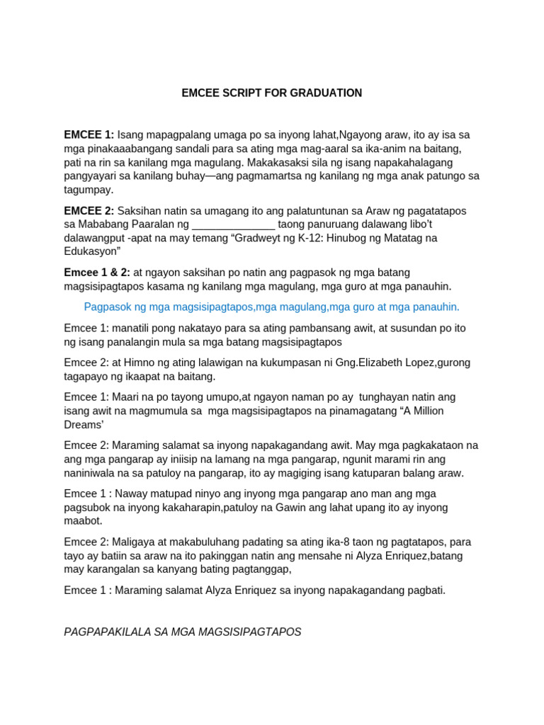 Emcee 1: Maraming salamat gradwets at muli ay binabati naming kayong lahat .Sana