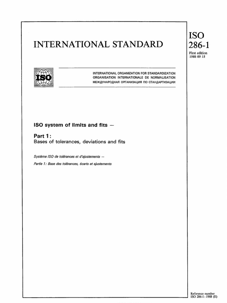IS0 (the International Organization for Standardization) is a worldwide federation of national standards bodies (IS0 member bodies). The work of preparing International Standards is normally carried out through IS0 technical committees. Each member body interested in a subject for which a technical committee has been established has the right to be represented on that committee. International organizations, governmental and non-governmental, in liaison with ISO, also take part in the work. Draft International Standards adopted by the technical committees are circulated to the member bodies for approval before their acceptance as International Standards by the IS0 Council. They are approved in accordance with IS0 procedures requiring at least 75 % approval by the member bodies voting, This part of IS0 286 has been prepared by ISO/TC 3, Limits and fits, and, together with IS0 286-2, completes the revision of ISO/R 286, /SO system of limits and fits. ISO/R 266 was first published in 1962 and subsequently confirmed in November 1964; it was based on ISA Bulletin 25 first published in 1940. The major changes incorporated in this part of IS0 266 are as follows :
