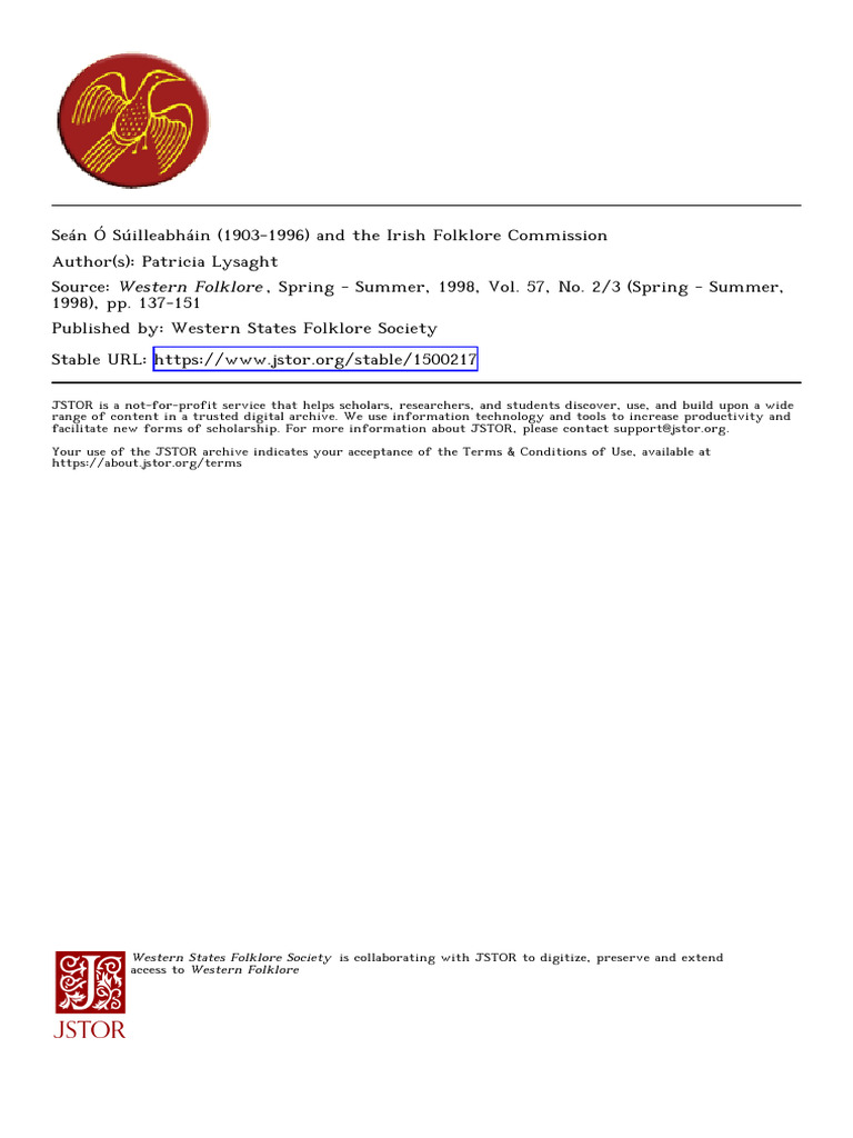 O'Sullivan, Seain. 1957a. The Collection and Classification of Folklore in Ireland