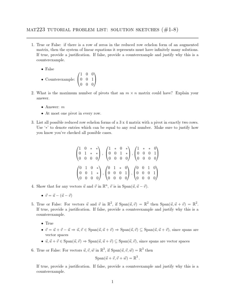 1. True or False: if there is a row of zeros in the reduced row echelon form of an augmented