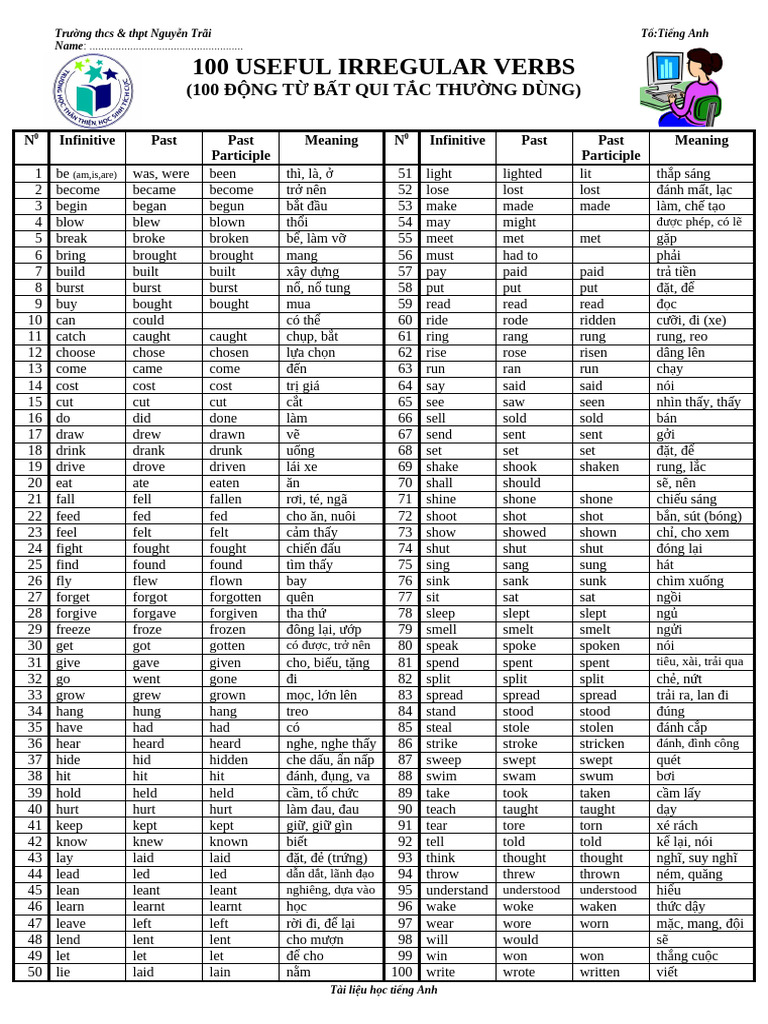 (100 ĐỘNG TỪ BẤT QUI TẮC THƯỜNG DÙNG)