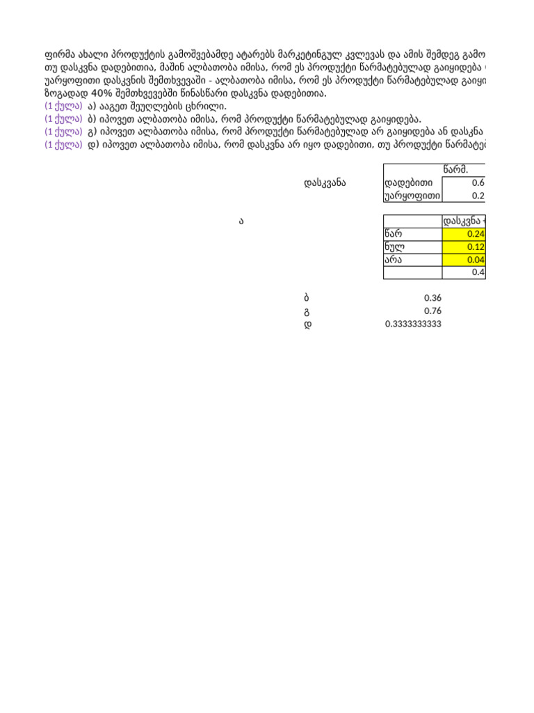 (1 ქულა) დ) იპოვეთ ალბათობა იმისა, რომ დასკვნა არ იყო დადებითი, თუ პროდუქტი წარმატებით გაიყიდ