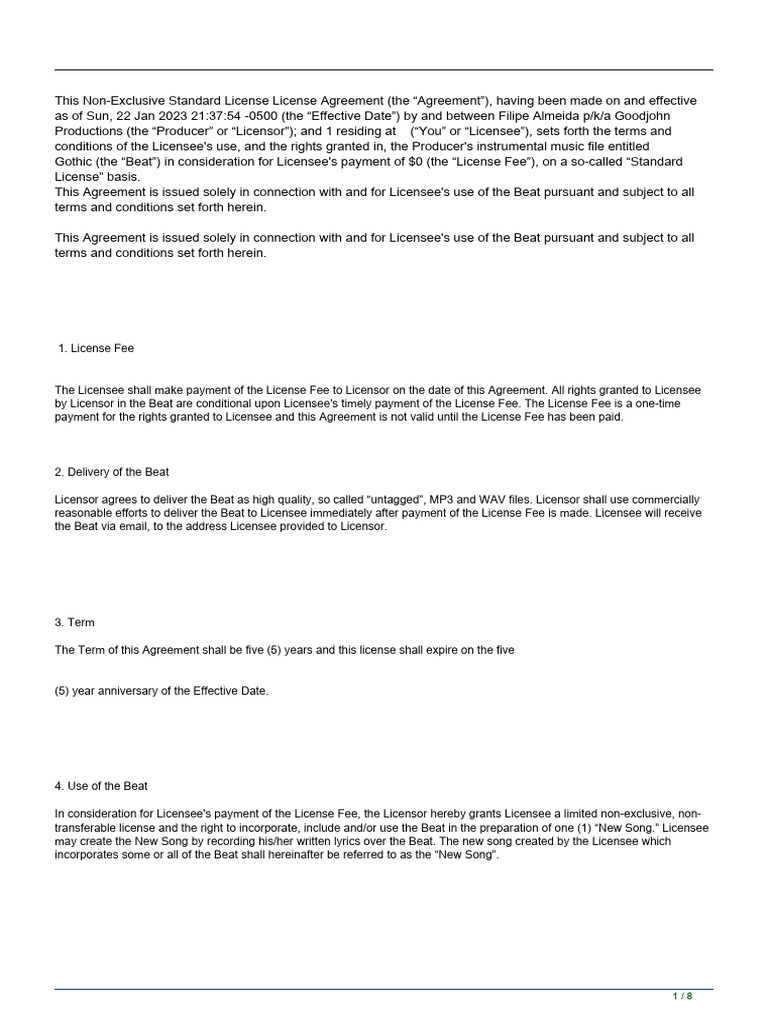 Gothic (the “Beat”) in consideration for Licensee's payment of $0 (the “License Fee”), on a so-called “Standard