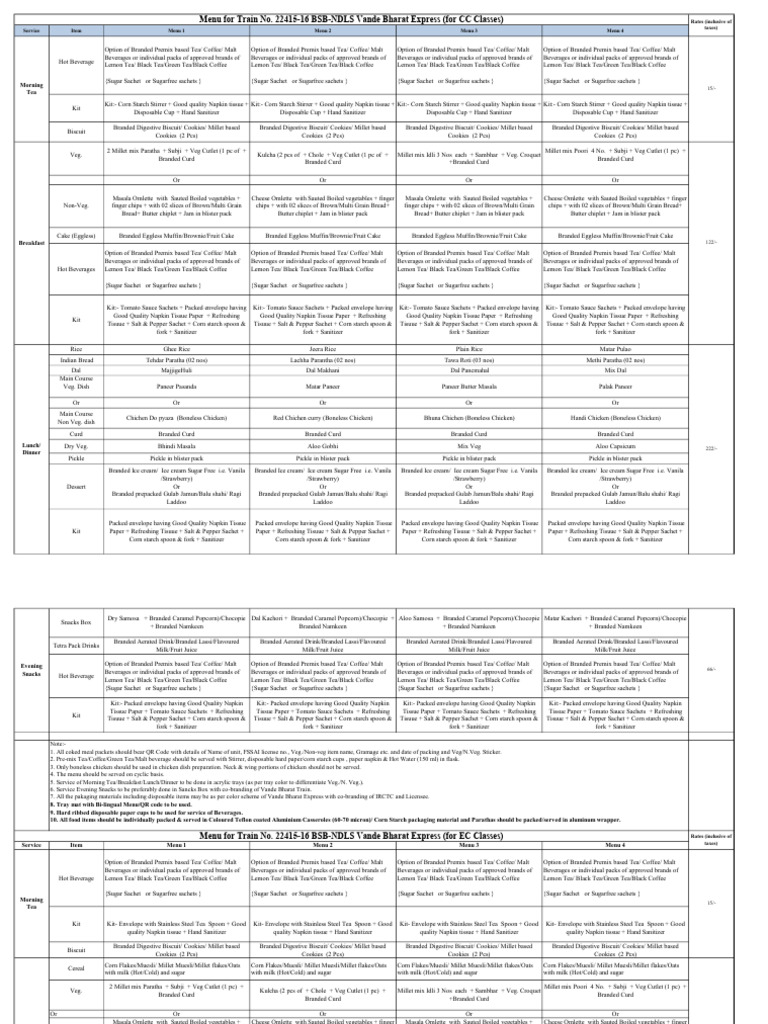 Menu for Train No. 22415-16 BSB-NDLS Vande Bharat Express (for EC Classes) Rates (inclusive of