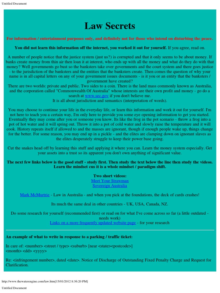For information / entertainment purposes only, and definitely not for those who intend on disturbing the peace. You did not learn this information off the internet, you worked it out for yourself. If you agree, read on. A number of people notice that the justice system (just us?) is corrupted and that it only seems to be about money. If banks create money from thin air then loan it at interest, who ends up with all the money and what do they do with that money? Well governments go bust so the banksters take over governments and the court system and there goes justice - to the jurisdiction of the banksters and the entities that the banksters create. Then comes the question of why your name is in all capital letters on any of your government issues documents - is it you or an entity that the banksters / government have created? There are two worlds: private and public. Two sides to a coin. There is the land mass commonly known as Australia, and the corporation called "Commonwealth Of Australia" whose interests are their own profit and money - go do a search at www.sec.gov if you don't believe me. It is all about jurisdiction and semantics (interpretation of words). You may choose to continue your life in the everyday life, or learn this information and work it out for yourself. I'm not here to teach you a certain way, I'm only here to provide you some eye opening information to get you started. Eventually they may come after you or someone you know. Its like the frog in the pot scenario - throw a frog into a pot of hot water and it will spring out. Throw it into a pot of cold water and slowly raise the temperature and it will cook. History repeats itself if allowed to and the masses are ignorant, though if enough people wake up, things change for the better. For some reason, you may end up in a pickle - and the elites are clamping down on ignorant slaves as the elites desperately struggle to keep their power base going. Cut the snakes head off by learning this stuff and applying it where you can. Learn the money system especially. Get your assets into a trust so its apparent you don't own anything of significant value. The next few links below is the good stuff - study first. Then study the text below the line then study the videos. Learn the mindset cus it is a whole mindset / paradigm shift. Two short videos: Meet Your Strawman Sovereign Australia Mark McMurtrie - Law in Australia - and when you pick at the foundations, the deck of cards crashes! Its much the same deal in other countries - UK, USA, Canada, NZ. Do some research for yourself (recommended first) or read on for what I've come across so far (a little outdated needs work) Links on a more frequently updated website page - for your research An example of what to write in response to a parking / traffic ticket: In care of: <number> <street / type> <suburb> [near <state><postcode>] <month> <dd> <yyyy> Re: <infringement number>, dated <date>. Notice of Discharge of Outstanding Fixed Penalty Charge and Request for Clarification.