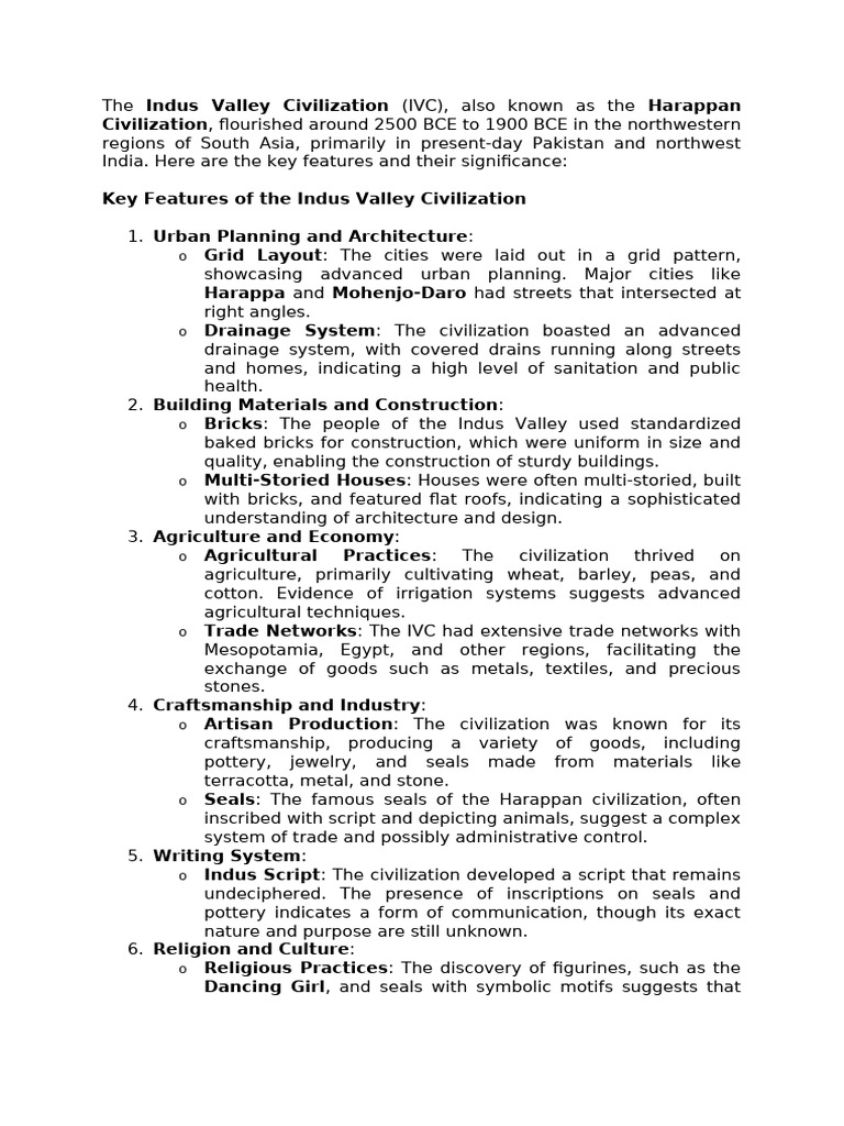 Key Features of the Indus Valley Civilization