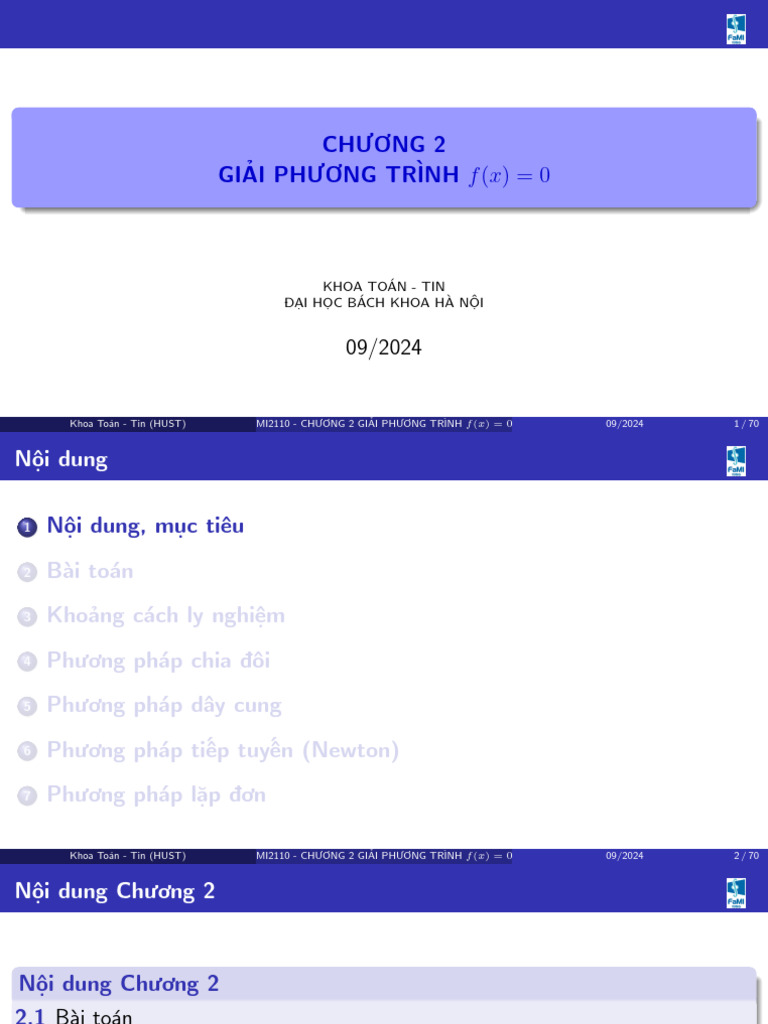 Khoa Toán - Tin (HUST) MI2110 - CHƯƠNG 2 GIẢI PHƯƠNG TRÌNH f (x) = 0 2/70 09/2024 2 / 70