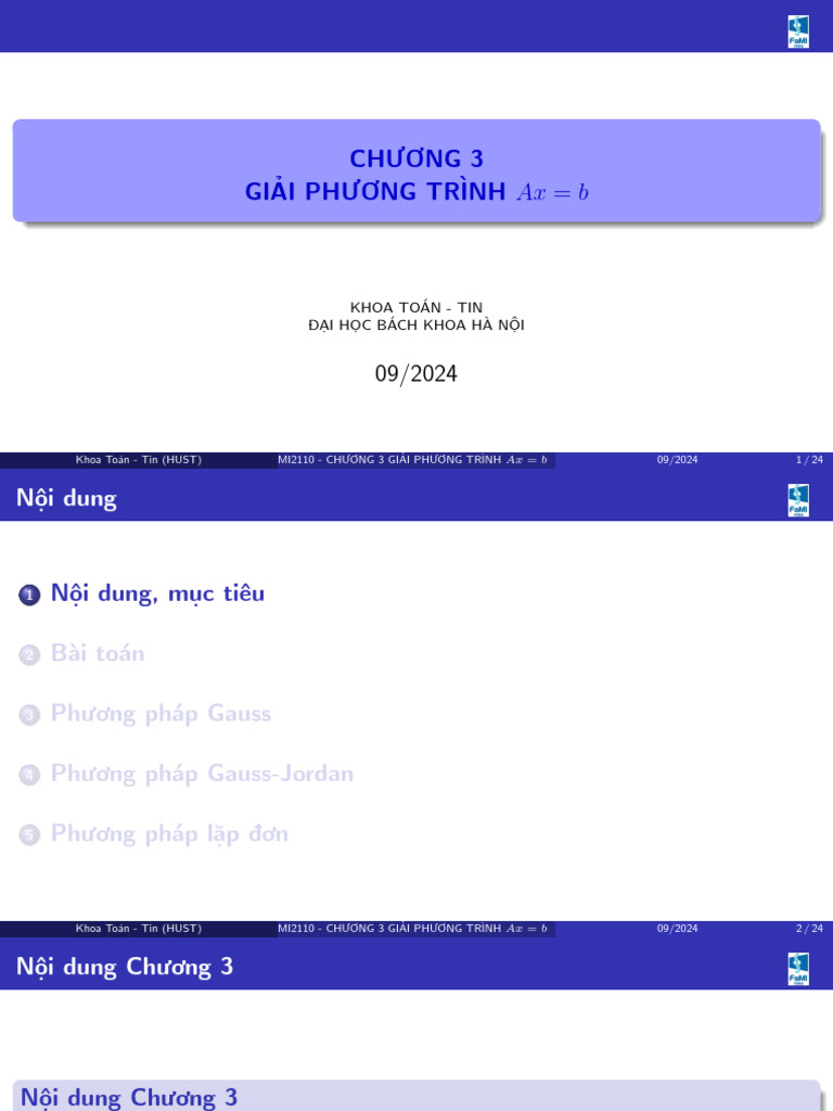 Khoa Toán - Tin (HUST) MI2110 - CHƯƠNG 3 GIẢI PHƯƠNG TRÌNH Ax = b 1/24 09/2024 1 / 24