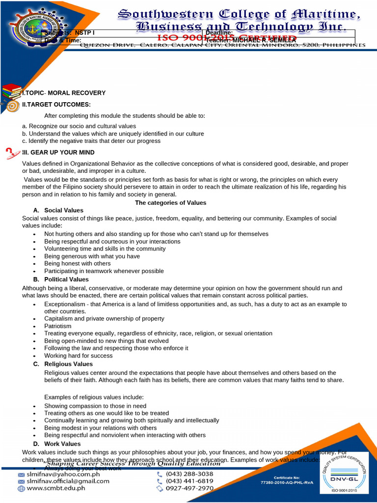 which you make decisions. Morals are learned from your parents and your experiences. Examples of moral values include: