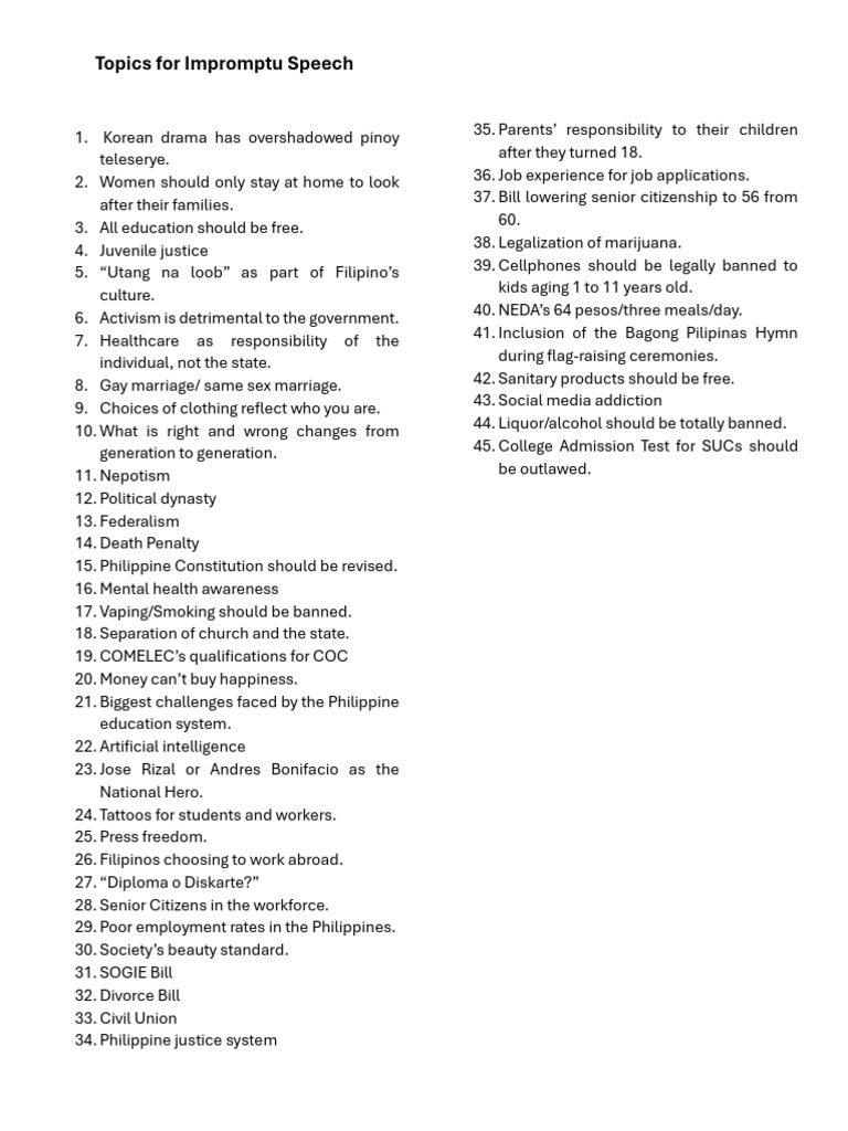 Topics for Impromptu Speech