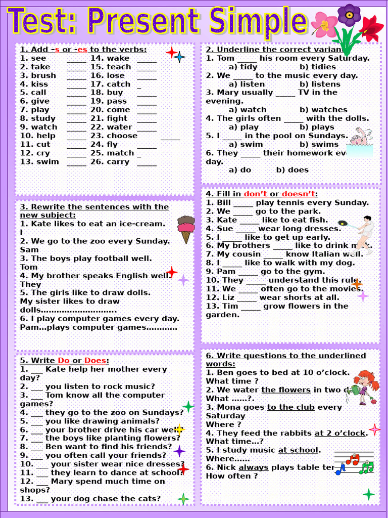 1. Add –s or -es to the verbs: 2.