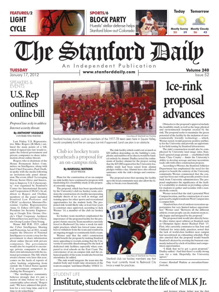 a positive self-image. For me, it comes down to actually maintaining a balance between eating well, stressing less and making time for stuff that makes me happy. Easier said than done, but I think its doable. Be Spontaneous(er) I support the concept of going with the flow.As a California native, Im all for not forcing things to happen and seeing where life takes you. Yet, I would not consider myself impulsive. Even though being spontaneous is normally associated with doing stuff without thinking, that doesnt necessarily have to be a bad thing. Were Stanford students. We like to think and were good at it (duh, thats how we got in here in the first place), but sometimes there is a downside to thinking too much, i.e. overthinking the little stuff. Sometimes, its just better to go for it than analyze it later. Like Nike says, Just do it. After all, if we cant believe in a multimilliondollar brand, then who can we trust? I am determined to stay strong. Why? Besides the personal fulfillment that comes with maintaining resolutions past January 2, they are also legitimate things that I have the power to change.These little changes might even be the rainbows that come with rain in the winter. Camira would love to hear your resolutions for this year, too. Let her know at camirap@stanford.edu well attended, Carson said he wished 100 more students had come to the Friday Celebration. I do believe that were still cognizant of the day [and] recognize it, Anderson said. But I feel like there is a lot more room for development, thinking about it and actually having events on campus. Woods, who works for the Black Community Service Center on campus, said that despite what she perceives as a lack of enthusiasm in recent years, she believes Stanford is shifting. More is being done, Woods said. I know that the MLK Institute . . . [is] actually partnering up with more groups and are trying to do more tours of the Institute because how many people have actually visited? People are doing more, but its going to take a while, she added. Contact Julia Enthoven at jjejje@ stanford.edu. process. Cuellar remarked that policymakers around the world are becoming more interested in the issue of cybersecurity. This is one reason for CISACs increased involvement in this area of study. As with national security and criminal justice problems more broadly, the choices we make to secure cyberspace will have farreaching effects on our lives, Cuellar wrote. Americans should recognize that the stakes here are partly about the safety and security of computer networks, but also about identity management and privacy, international cooperation and the role of the public sector. In addition to his visit to Stanford, Rogers said he planned to meet with the leaders of tech companies in the area. He declined to state which companies he intended to visit. Contact Anthony Vazquez at vasquez2@stanford.edu.