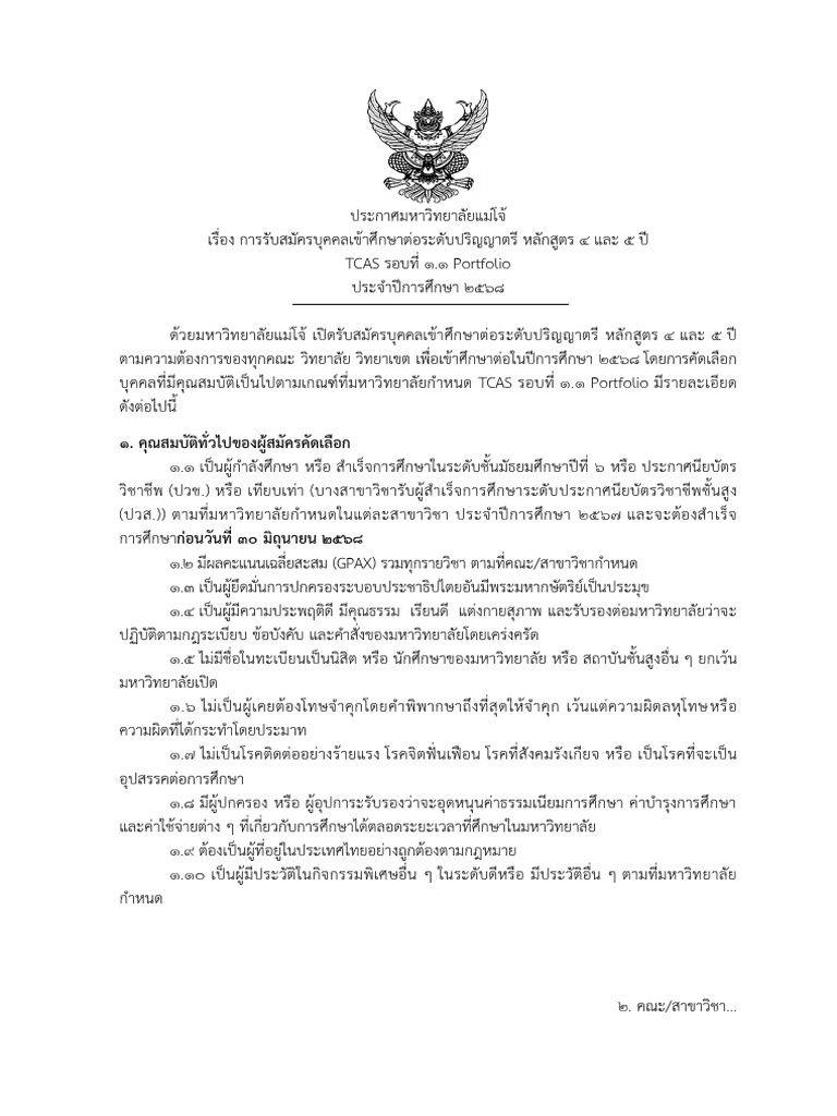 2 มิถุนายน 2568 ได้ที่ admissions.mju.ac.th เป็นต้นไป