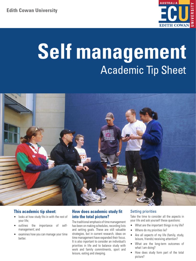 Self-management techniques are vital to be a successful student. It is quite common that students drop-out of university not because they find the course too difficult to cope with, but because they become overwhelmed by the workload and are unable to manage study commitments with work and family life. You can avoid this dilemma by being organised and maintaining a healthy balance in all areas of your life. This will help you minimise stress and stay motivated in your studies.