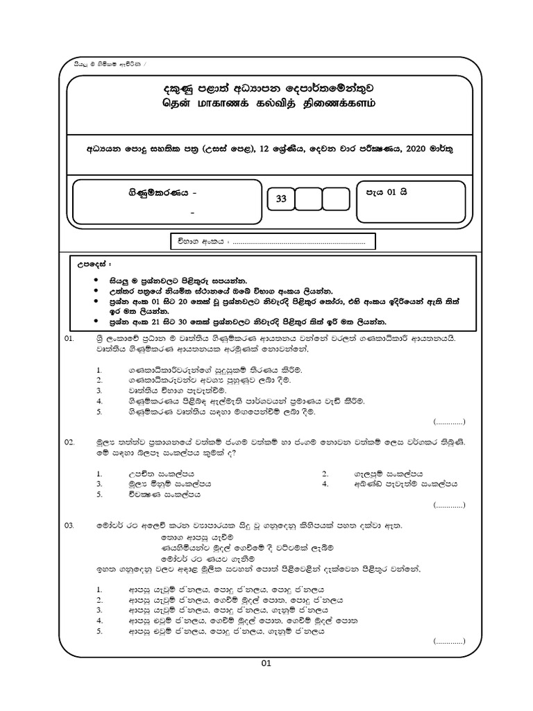 General Certificate of Education (Adv. Level), Grade 12, Second Term Test, March 2020