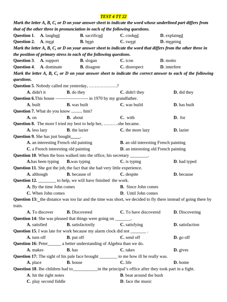 Question 1. A. laughed B. sacrificed C. cooked D. explained