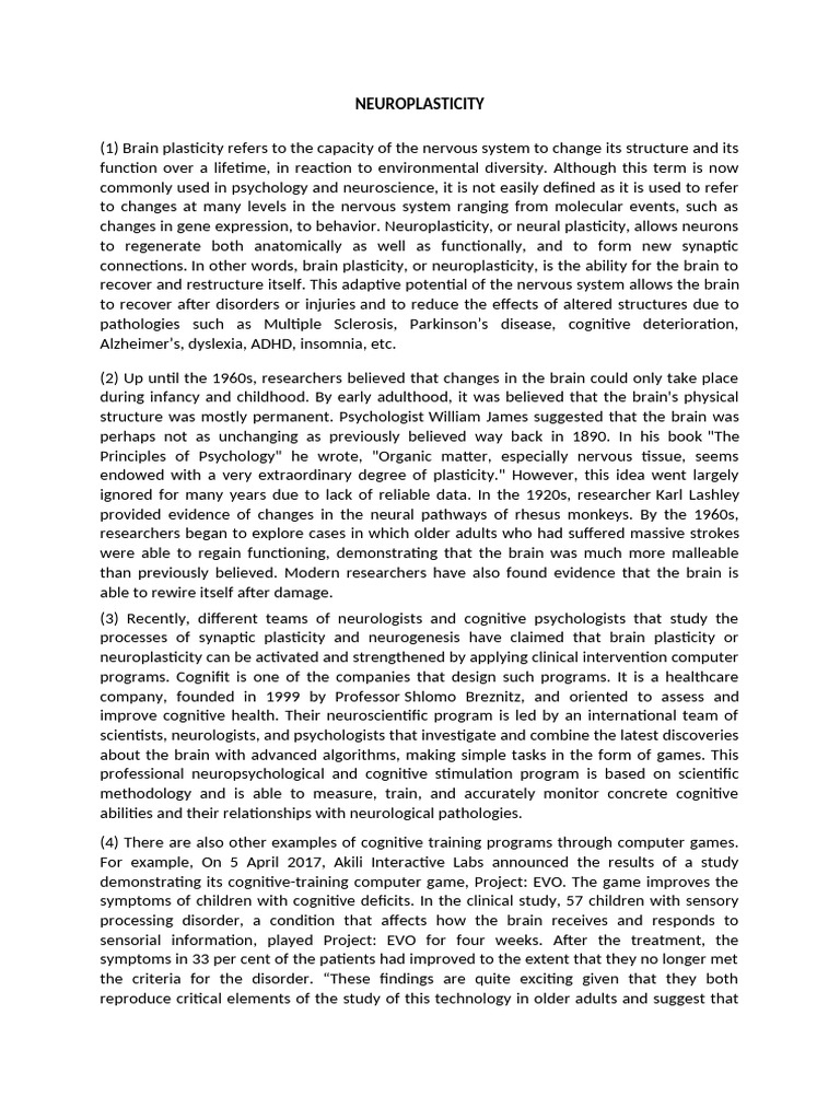 connections. In other words, brain plasticity, or neuroplasticity, is the ability for the brain to