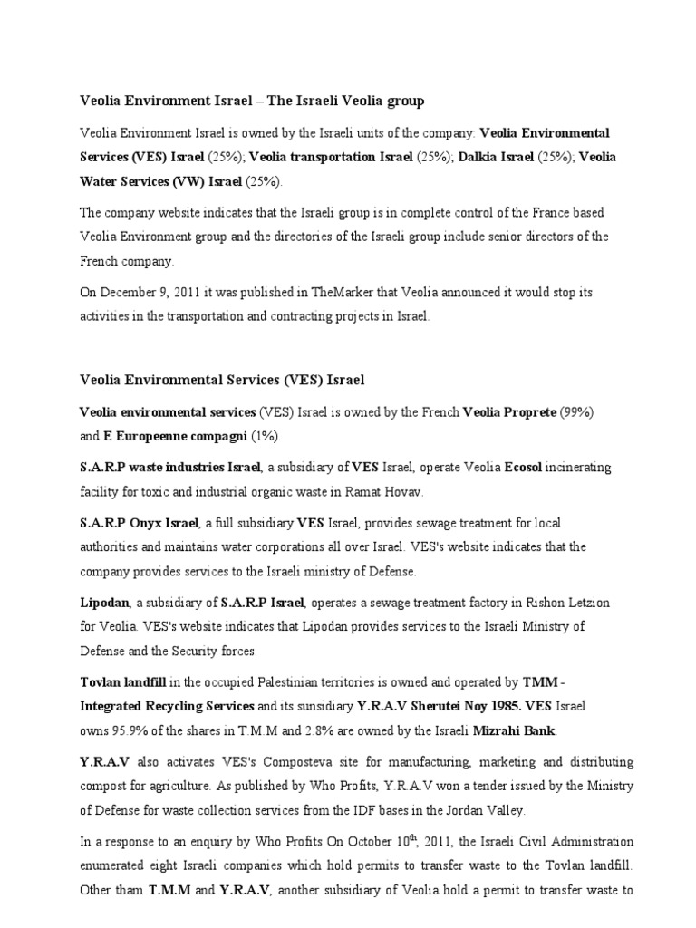 Veolia Environment Israel is owned by the Israeli units of the company: