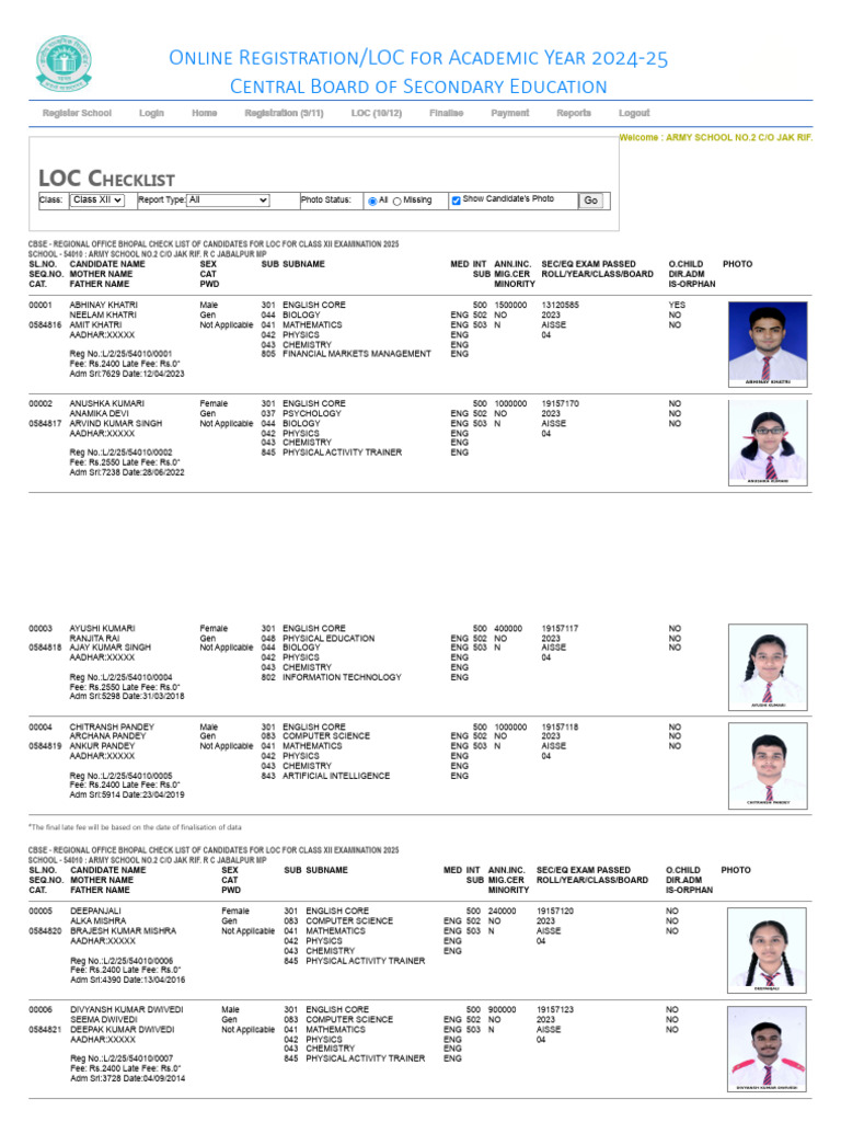 CBSE - REGIONAL OFFICE BHOPAL CHECK LIST OF CANDIDATES FOR LOC FOR CLASS XII EXAMINATION 2025
