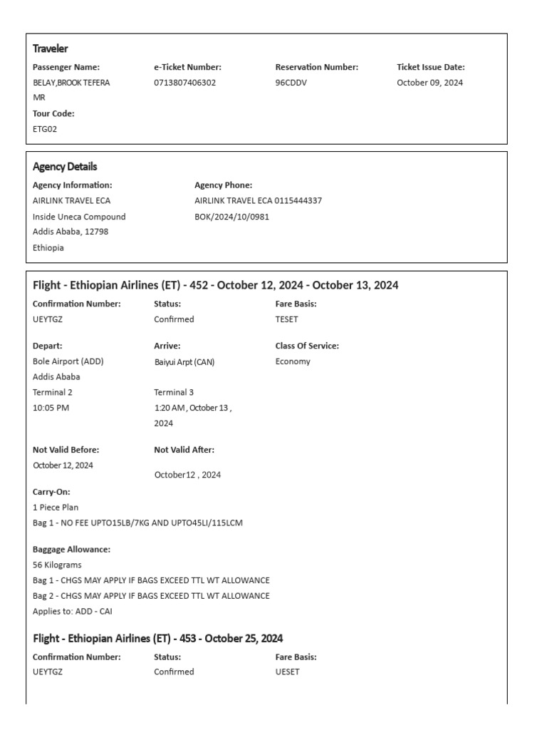 Flight - Ethiopian Airlines (ET) - 452 - October 12, 2024 - October 13, 2024