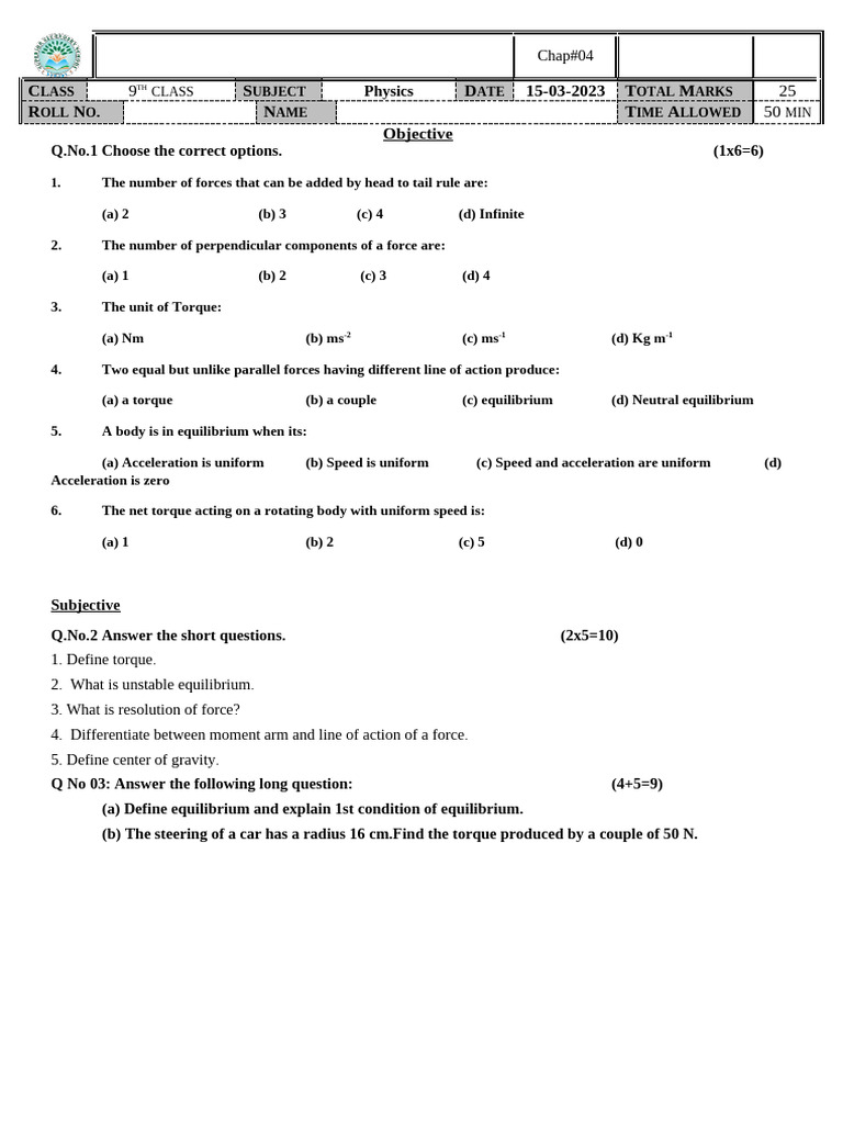 CLASS 9TH CLASS SUBJECT Physics DATE 15-03-2023 TOTAL MARKS 25