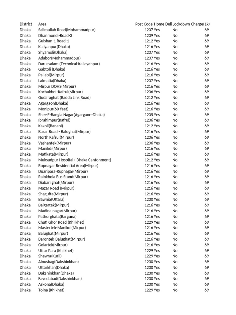 District Area Post Code Home DelivLockdown Charge(1kg