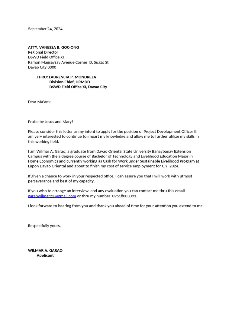 Please consider this letter as my intent to apply for the position of Project Development Officer II. I