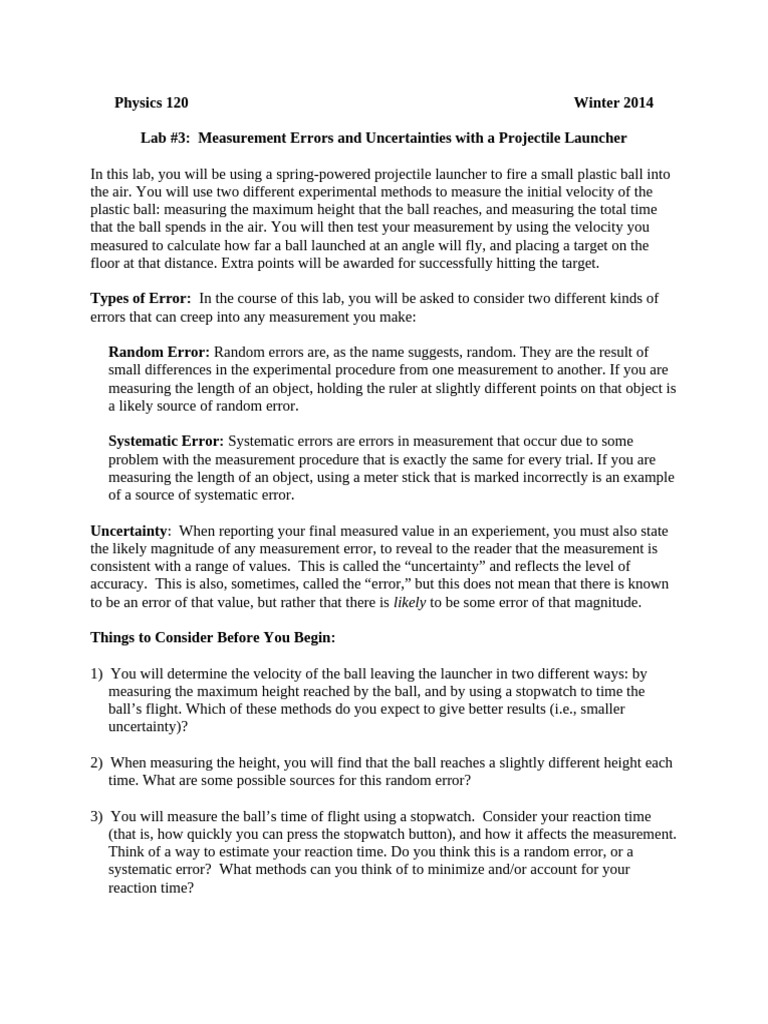Lab #3: Measurement Errors and Uncertainties with a Projectile Launcher