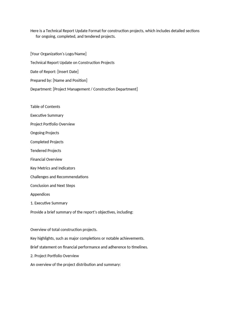 Here is a Technical Report Update Format for construction projects, which includes detailed sections