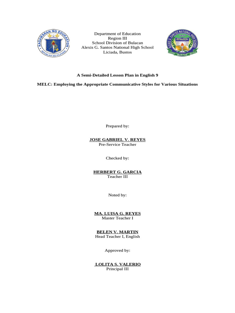 A Semi-Detailed Lesson Plan in English 9