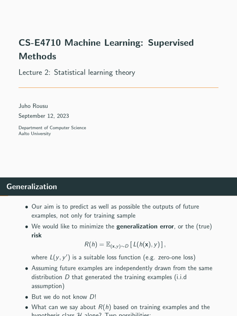 • Statistical learning theory (Lectures 2 and 3)