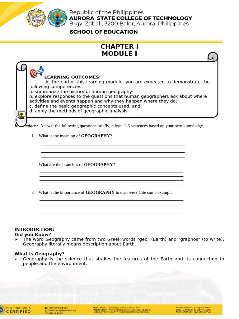 GEOGRAPHY 1 Instructor: ANALIZA T. DICTADO